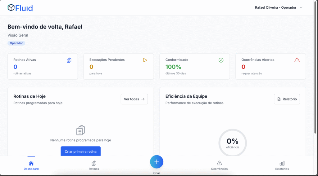 O Dashboard é a tela inicial do Fluid, onde você visualiza um resumo das principais informações sobre as rotinas e a performance da equipe.