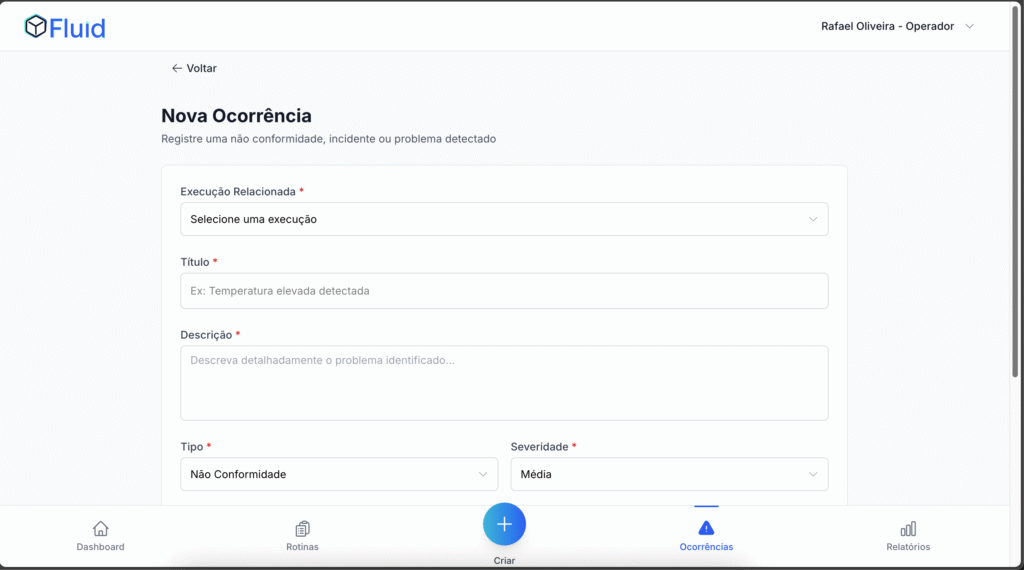 A tela de Ocorrência permite registrar qualquer não conformidade, incidente ou problema detectado durante a execução de uma rotina.