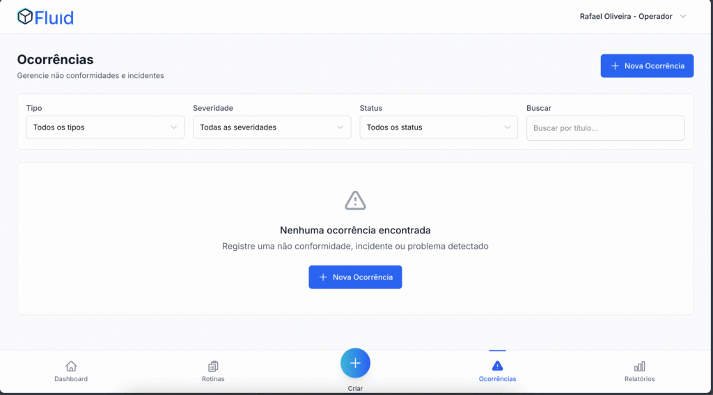 A tela Ocorrências do Fluid é o espaço onde você pode gerenciar não conformidades, incidentes e problemas identificados nas operações.